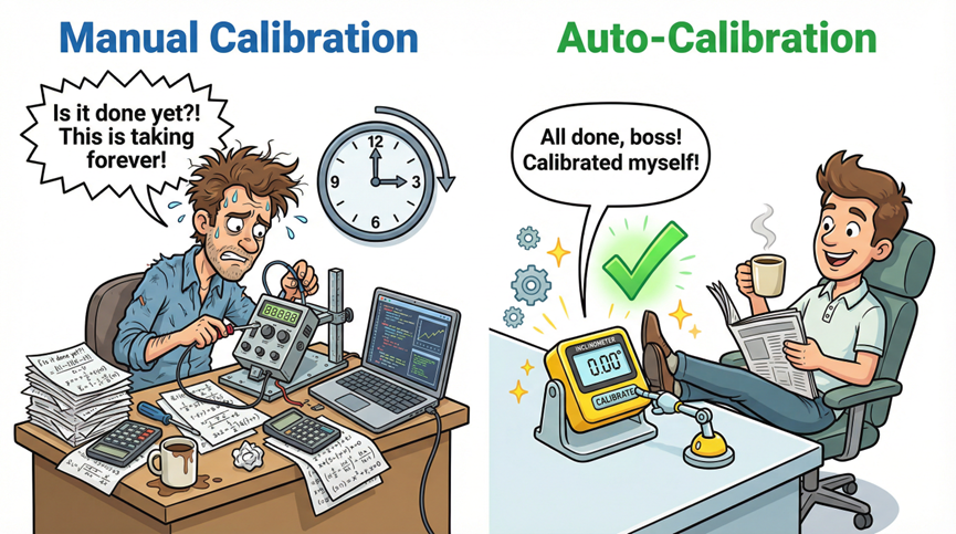 Modern smart inclinometers like the TS-2322-R04 integrate auto-calibration firmware that:
