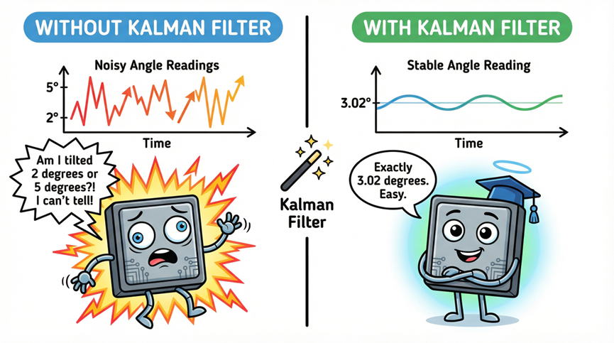 - Update – It compares the predicted tilt against the new raw accelerometer reading, weighting each by their respective uncertainties (process noise vs. measurement noise).
